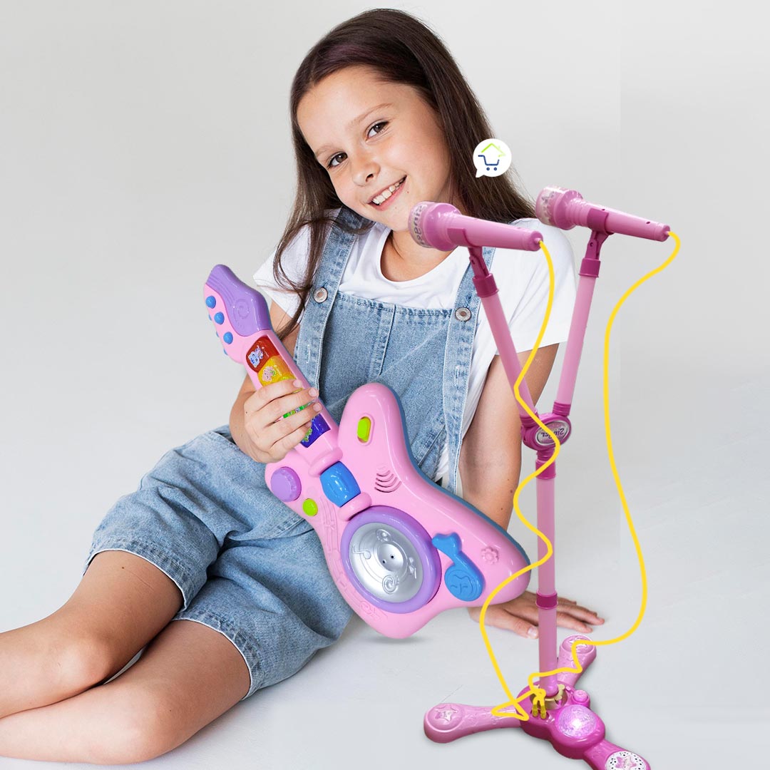 Material: Plástico. Tamaño ajustable del micrófono hasta 110 cm Aprox. Tamaño guitarra: 21 x 41 x 4.5 cm / micrófono: 18 cm Peso aprox.: 683 g. Para su funcionamiento requieren de 6 pilas AA (tres en cada uno, NO incluidas) Micrófono doble es ideal para sentirse toda una estrella junto a tus amigos cantando tus canciones preferidas. Micrófono de pie bifurcado con dos micrófonos de cable que se conectan a la base. Tanto la guitarra como la base del micrófono tienen luces. Recomendado para niñas de 3 años en adelante. La guitarra viene con tres modos: modo Piano, modo musical y modo de sonidos de animales. Las teclas presentes en la guitarra vienen con dibujos de lindos animales. La guitarra viene con diferentes botones que al ser presionados suenan o cambian entre los tres modos. Botones suaves, ideal para las manos de los niños. Desde una edad temprana la música ayuda con el desarrollo de los niños, ayudando al desarrollo de la memoria, la confianza, a la integración social y fomentando la creatividad. Contenido del Paquete 2 Micrófonos 1 Base para micrófono 1 Base dual para micrófono 1 Palo ajustable para micrófonos. 1 Guitarra luces y sonidos. 100 % Nuevo.